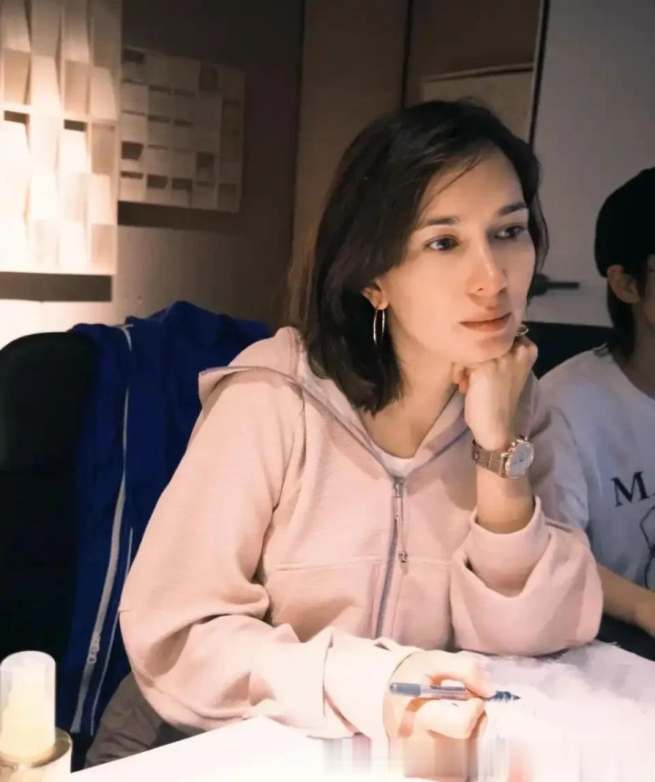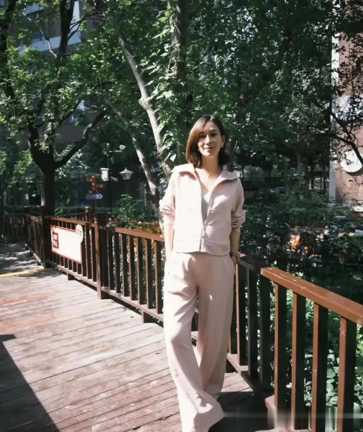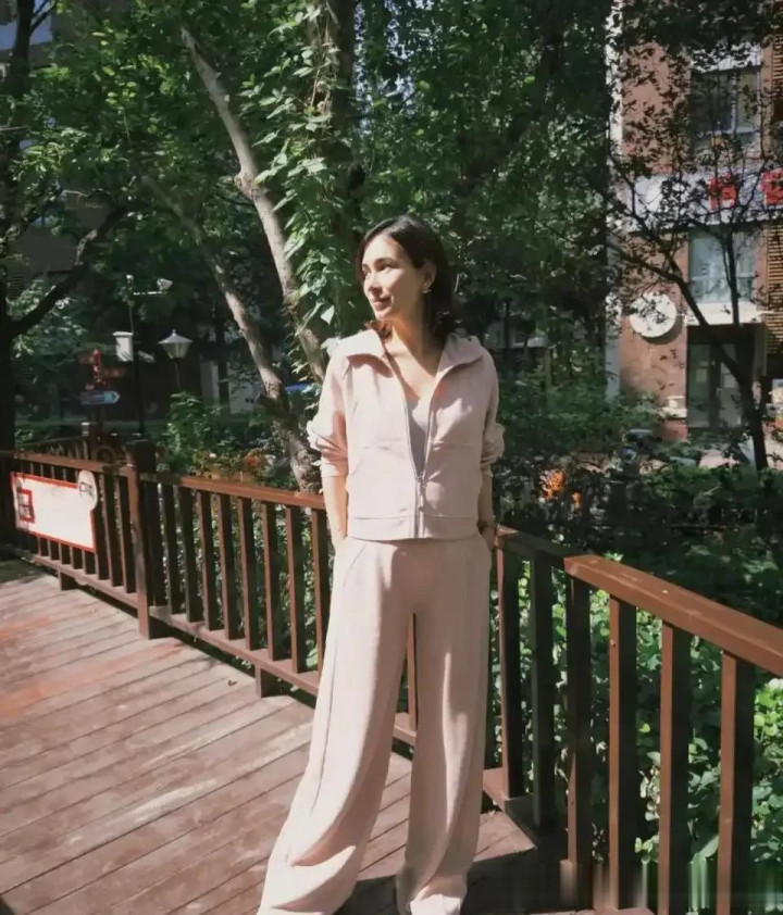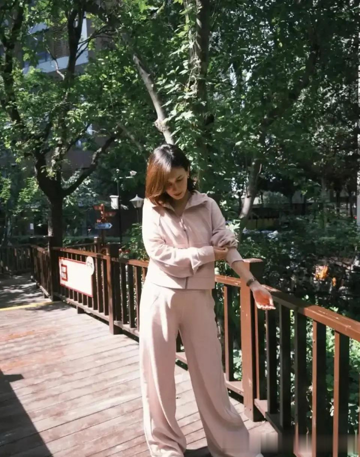 > 卢靖姗穿粉色年轻好几岁, 粉色连帽衫搭配粉色休闲裤, 状态好到爆